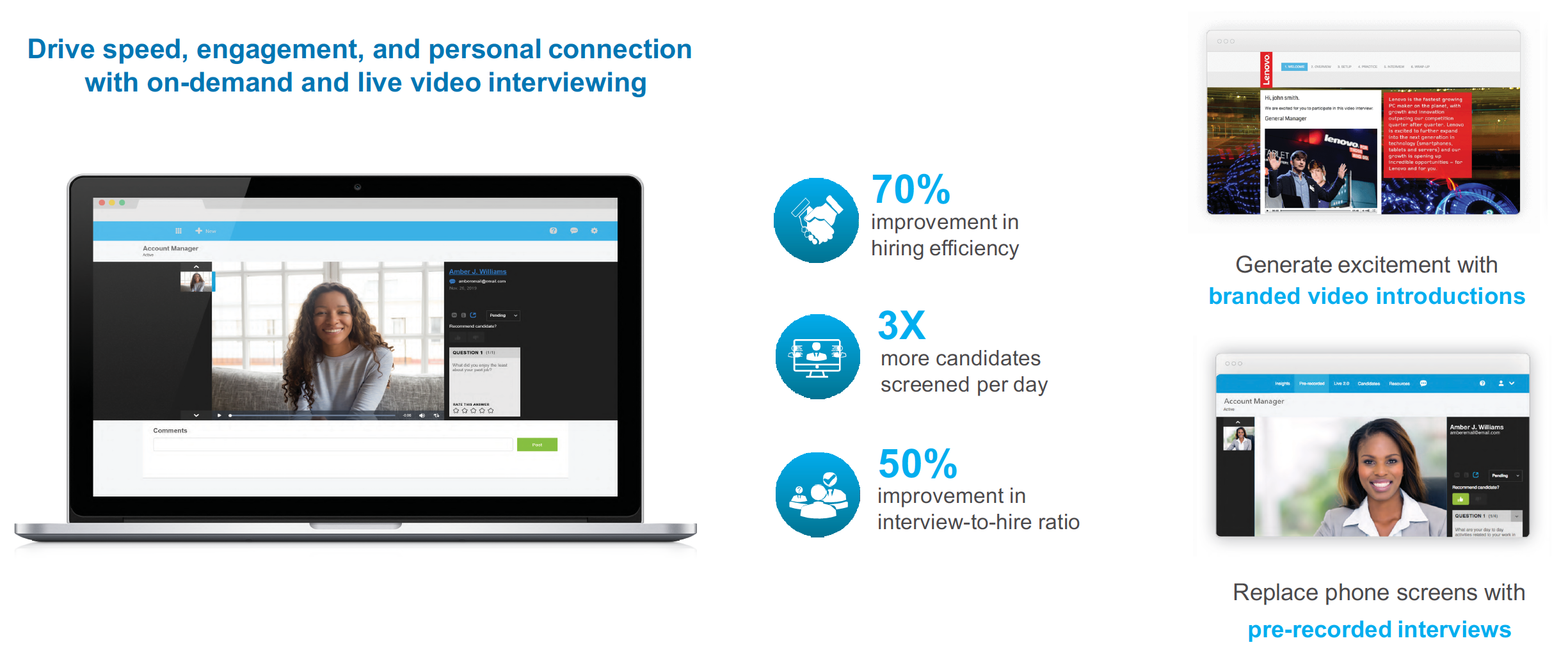 Drive speed, efficiency, engagement and personal connection with on demand and live video interviewing. Video interviewing allows recruiters to be more strategic and partner more effectively with line managers.